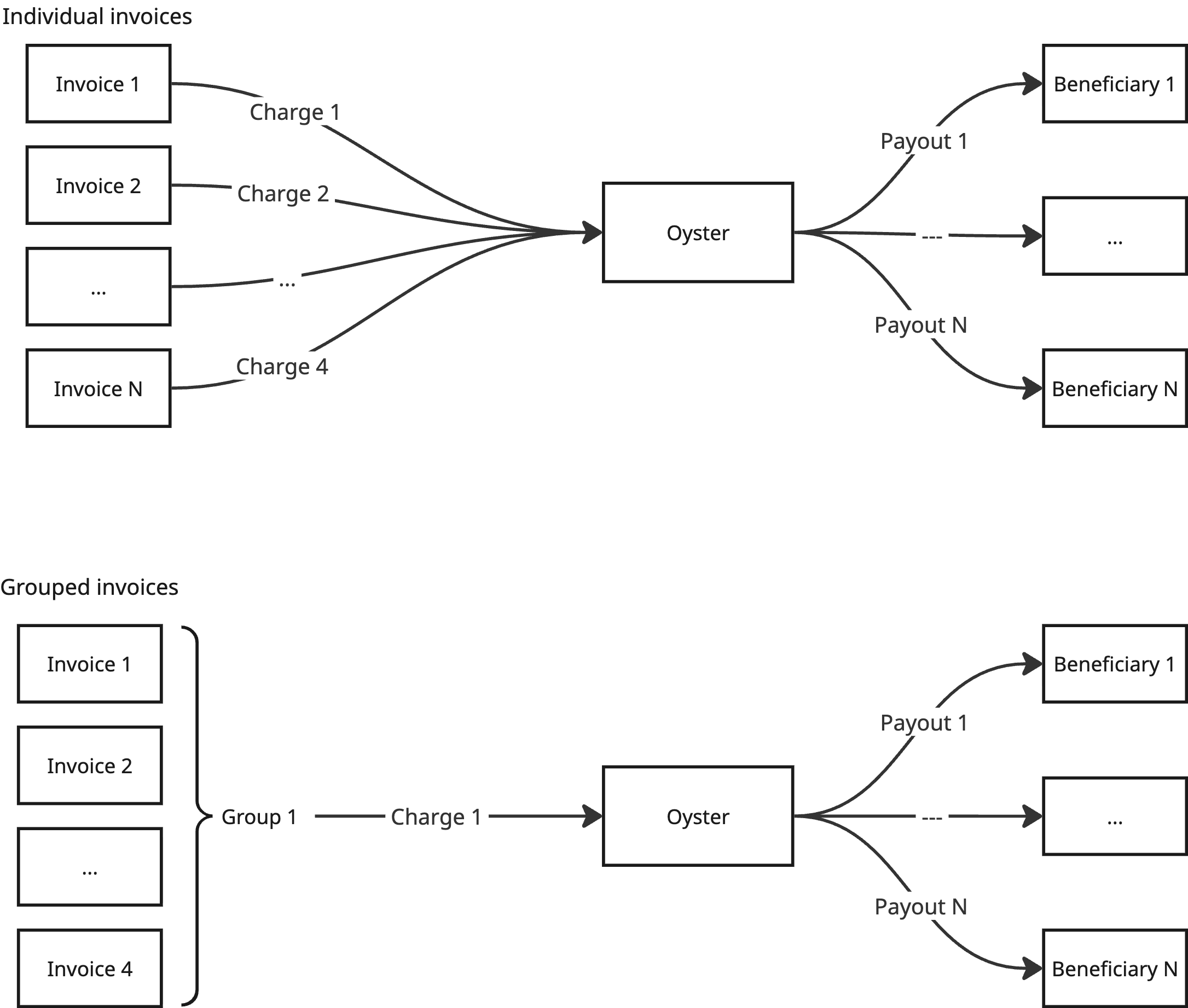 Charge group: a higher-level bundle of invoices aggregated for payment operations. A group has a unique identifier and it relates to all the invoices underneath it.